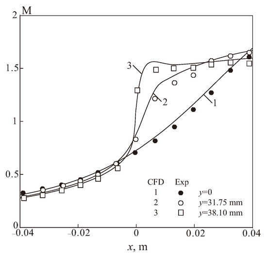 An experimental and numerical study of the initial section of a supersonic underexpanded jet flowing from a convergent axisymmetric nozzle and a nozzle with chevrons is performed in [9]. The length of the jet’s initial section grows as the Mach number increases because as the mixing intensity reduces, the jet mixing layers’ thickness decreases, and so on. Relations that restrict the rise of turbulent viscosity and turbulence energy close to shock waves are utilized to enhance the accuracy of description of turbulent flows in the presence of shock waves [10,11]. Creating approximations for the terms in the transport equation of turbulent kinetic energy [12,13] that account for the effect of compressibility on turbulence and altering the model constants [14,15] are the two most popular methods of modifying a turbulence model.