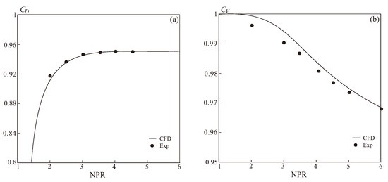 Figure 14 displays the nozzle thrust and discharge coefficient for different nozzle pressure ratios, compared to measurements [43]. The discharge coefficient estimated values (solid lines) correspond well with the experimental data (symbols •). When the pressure ratio rises to 2, the discharge coefficient increases dramatically before staying rather steady after that. At low nozzle pressure ratios, the discharge coefficient is nearly constant; as the pressure ratio rises, it decreases by 4–5%. Regarding the discharge coefficient, the computational and experimental data agree well; however, the CFD findings overestimate the nozzle thrust coefficient by approximately 2–2.5% when compared to the measurements.