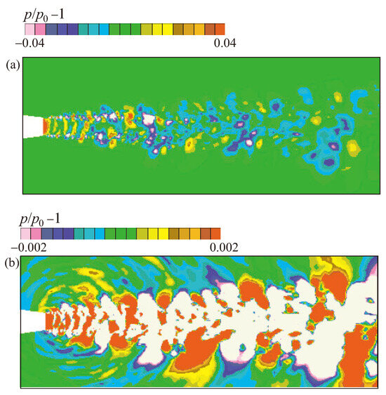 Contours of pressure in flow (a) and acoustic (b) scales.