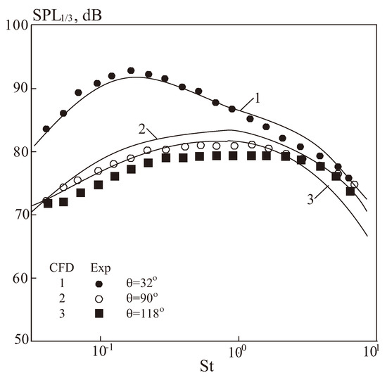Ten azimuthal angles are used to further average the acquired data. Figure 18 displays a comparison between the third-octave far-field noise spectra and experimental data [45]. Figure 19 displays a comparison of the directivity patterns of supersonic jet integral noise with measurements [45,46]. Within the range of Strouhal numbers , the spectra correlate well with the experimental results. The integral level of the spectral energy matches the experimental one, and it is spread pretty evenly, with a bias towards higher frequencies.