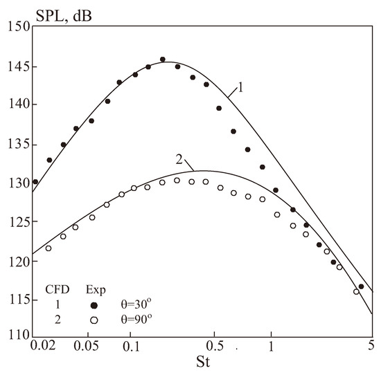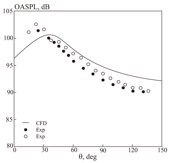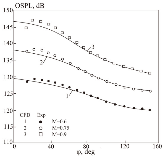 At , the experimental data from [47] (symbols) is compared with calculated distributions (solid lines) of the integral SPL in the circumferential direction at the nozzle outlet, corresponding to the subsonic outflow regime, as can be seen in Figure 20.