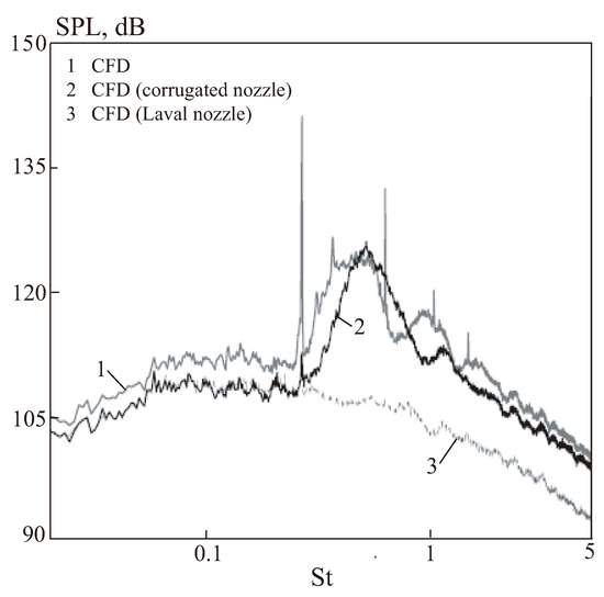 The spectrum of sound pressure in a supersonic jet is shown in Figure 22 at (). Line 1 corresponds to numerical calculations of the jet flowing from a tapering conical nozzle. Lines 2 and 3 are taken from the work of [48] and correspond to the outflow of a jet from a corrugated nozzle, which makes it possible to suppress the screech effect, and the Laval nozzle.