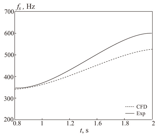 Figure 23 presents the discrete tone frequency calculation results compared with experimental data. The dynamics of the process are rather accurately described by the model. The primary distinction is that the experiment shows a faster increase in discrete tone frequency than the model does.