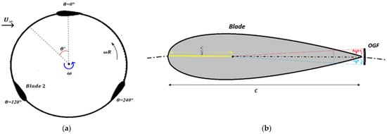 The use of renewable energy sources such as wind energy has become increasingly important in recent years. It can be considered as an efficient solution to reduce the dependence on fossil fuels and mitigate their impact on climate change. Among different types of wind turbines, vertical axis wind turbines (VAWTs) have gained attention in recent years as a promising technology for small-scale and distributed wind energy systems [,,]. VAWTs do not require a yaw mechanism to align with the wind direction, which makes them more suitable for urban and low-wind-speed environments. However, the performance of VAWTs is still not comparable with that of horizontal axis wind turbines (HAWTs) [], mainly due to the complex flow dynamics around the turbine blades. Among potential solutions to improve the performance of VAWTs is the use of a gurney flap, which is a small flap attached to the trailing edge of the turbine blade [,]. The gurney flap (GF) has attracted significant interest among researchers as a passive flow control device. This is primarily because of its simple geometry modification, low production cost, and notable performance enhancement, particularly at low tip speed ratios (TSRs). Recently, an innovative GF concept has been proposed by several researchers, which is the oscillating or deformable gurney flap OGF. The OGF can alter its position between the upper and lower blade surfaces during the turbine flapping or rotation [,].