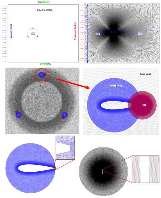 Table 1 shows the geometric parameters of a three-blade Vertical Axis Wind Turbine (VAWT) rotor examined in this study. Previous work has used the same rotor design for 2D simulations []. Since 3D simulations are computationally expensive, we opted for a 2D computational domain (Figure 1). Although connecting rods could have a significant impact, a study by Rezaeiha et al. [] showed that even with a shaft–diameter ratio of 16%, the maximum power only experienced a minor 5.5% decrease compared to a VAWT without shaft interference. Therefore, the shaft and connecting rods are disregarded. Our primary objective was to investigate the effect of OGF (presumably referring to a specific feature or modification) on VAWT performance, including wake interaction and flow curvature effects. Hence, the focus is put on these aspects, leading to the exclusion of the shaft and connecting rods from the study.