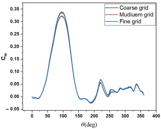 In order to investigate the dependence of the results on the computational grid, the simulation for the reference case is performed on three different grids: coarse, medium, and fine (see Table 2). As can be seen from Figure 3, good correlations between results are observed. A grid that has about 1,151,103 cells can precisely predict the moment coefficient and the fluid fields (Figure 3).