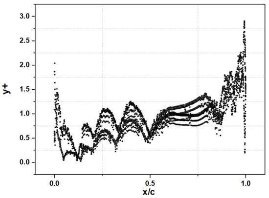 Variation of the dimensionless value y+ along the cord length.