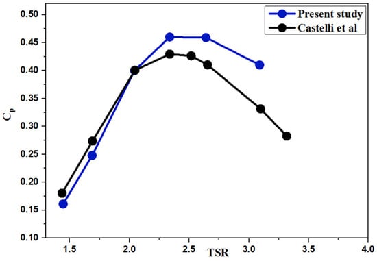 The current model has been validated against the work of Castelli et al. []. The calculated mean time power coefficient alongside the tip speed ratio, compared with the numerical results from Castelli et al. [] is presented in Figure 6.