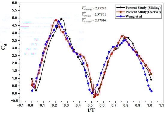 Time-varying drag coefficient for one period (comparison with Wang et al. []).