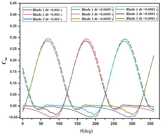 The reliability of the present solver is confirmed by testing it using three time steps. Figure 8 shows the results of the computational test. It can be observed that plots for two-time step sizes, 0.0005 s and 0.0001 s, overlap with each other. Consequently, the time-step test is validated. To minimize computational cost without sacrificing accuracy, the time step size of 0.0005 s is chosen.