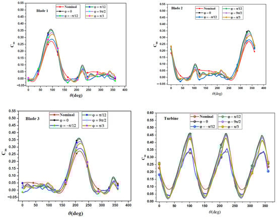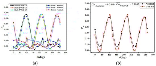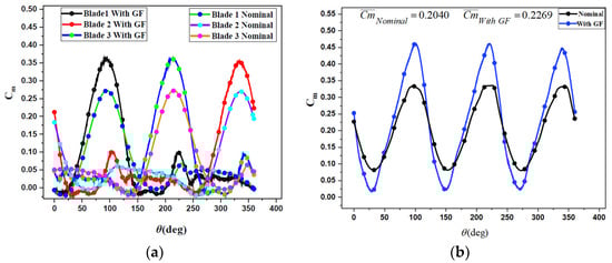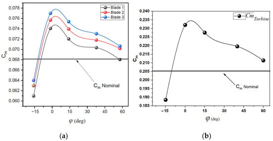 The average torque coefficient (Cm) as function of phase angle is presented in Figure 16. The horizontal line represents Cm of nominal case. It was indicated that the average individual Cm decreases sharply with the increase in φ. This is attributed to the fact that at the first quarter of the turbine and by increasing φ, the length of OGF in the blade pressure side decreases, which decreases the size and the strength of the trailing edge vortex, and the airfoil loses energy to the surrounding fluid. It was indicated that for negative φ, the average Cm is less than that of the nominal case; this is because the OGF is fully located in the blade lower surface.