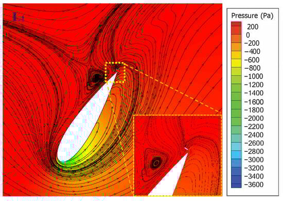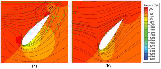 Figure 10 and Figure 11 show the torque coefficient for three blades during one turbine cycle. It can be noted that with the presence of OGF, the total Cm peak increases from 0.2040 to 0.2269, which represents an improvement of about 11%. This is attributed to the fact that a fluid backflow is induced by OGF on the blade pressure side, which forces more the fluid to converge increasing the pressure on this blade side. On the contrary, the blade without OGF has a smooth fluid flow pattern near the trailing edge, which means there will be less backflow. The pressure contour displayed in Figure 12 shows that the presence of the gurney flap, at , gives rise to a high-pressure region near the blade’s trailing edge.