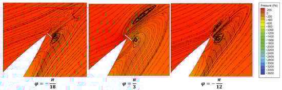 For various values of φ, it was noted that the phase angle that increases the GF length on the pressure side provides the highest peak of torque (Figure 14). For example, the selected negative phases make the gurney flap move toward the negative-pressure side by 9π/2 and −9π/2 drying the cycle in the first quarter, which will negatively affect the torque and therefore the extracted power. The phase φ = π/3, makes the OGF act like a fixed GF, which generates two vortices near the trailing edge (Figure 15). The detachment of these vortices causes a fluctuation before the torque beak, which does not improve the efficiency of energy collection.