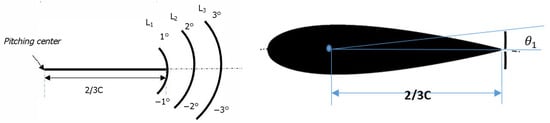 In this section, the impact of the gurney flap’s length on the effectiveness of energy extraction is investigated. Three lengths are used, which are L1, L2, and L3. L1 = 2/3 C×θ1, where θ1 is the angle of swinging relative to the pitching center. Three swing angles are tested θ1 = 1°, 2° and 3° (see Figure 17).