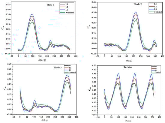 To better understand the effect of oscillating gurney flap on the turbine output power, deeper analyses of the instantaneous torque coefficient for each blade during one turbine rotation as well as the pressure distribution along each blade are considered []. A comparative analysis between a simple blade turbine and a controlled case (with a gurney flap length L = (c/6, θ1 = 3°) is carried out.