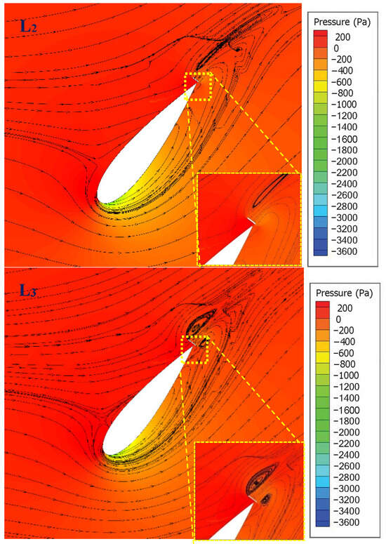 From Figure 18, it can be seen that the torque coefficient increases with the increase in the length of the swingable gurney flap under different flow conditions. Generally, by increasing the length of the gurney flap, the boundary layer separates and consequently leads to the generation of trailing edge vortices []. Figure 19 indicates that the blade with the smallest OGF has a smooth fluid flow pattern near the trailing edge, which means there is less backflow, and its behavior is similar to that of a clean blade. The expansion of the GF length from L1 to L2 generates a larger trailing edge vortex.