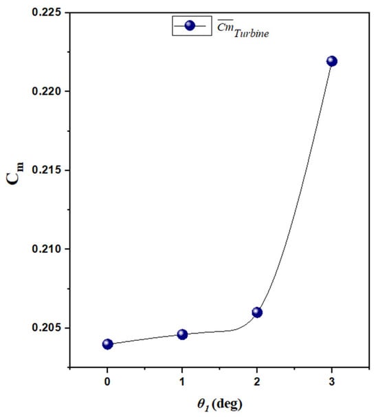 In Figure 20, the depiction of the correlation between θ1 and the average coefficient of movement can be observed. The evidence presented illustrates that as the angle θ1 increases gradually, there is a significant increase in the power output obtained from the turbine. This finding highlights a clear positive relationship between θ1 and the efficacy of the turbine in transforming kinetic energy from the airflow into useful mechanical power. These findings suggest that strategic manipulation of θ1 could be pivotal in optimizing turbine performance.
