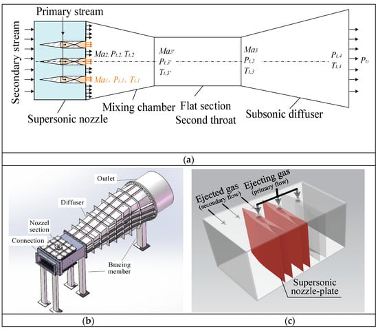 Supersonic–supersonic ejectors are a type of fluid device in which two supersonic gas streams are mixed and compressed, and are widely used in aerospace science and technology [1,2]; high effective cooling systems, such as gas compression cooling systems [3,4,5]; jet refrigerator [4,6]; high-altitude wind tunnels [7,8,9]; and other energy systems dealing with exhaust gases and wind engineering [10,11,12,13,14,15,16,17]. Unlike traditional subsonic ejectors, the supersonic–supersonic ejector remains attractive and fascinating due to its high performance and compactness. In general, a good understanding of the shear interaction behavior between two supersonic streams, the interaction of shock waves [5,11], turbulent mixing [4,6], supersonic instability [15] and boundary and shear layers in the ejector [17] is both necessary and fundamental for designing effective ejector–diffuser systems. The major advantages of supersonic–supersonic ejectors are their structural simplicity and functional reliability when used for gas ejecting and supercharging. However, their main deficiency is also inevitable due to the fact that the two supersonic gas streams (the ejected stream and the ejecting stream at the inlet of the mixing chamber) are mixed by only shear forces between these two streams, which means the static pressure difference between the ejected stream and the ejecting stream should not be too large to avoid aerodynamic choking [18]. For a supersonic–supersonic ejector, both the ejected stream and the ejecting stream are accelerated to supersonic flow through a convergent–divergent nozzle and the ejected stream will be over compressed. The kinetic energy of the ejecting stream converts into pressure energy in the limited mixing chamber and finally holds back the ejected flow due to the high backpressure. The static pressure ratio of the ejected stream to the ejecting stream at the occurrence of aerodynamic choking is called the limit pressure ratio. This should be considered especially during the design of the supersonic–supersonic ejector–diffuser system to improve its starting and supercharging performance.