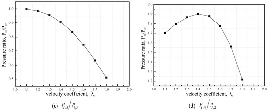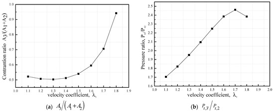 Figure 3 presents the relationship between the relevant velocity coefficient and the concerned parameters of the designed ejector regarding different mixing flow conditions. As shown in Figure 3a, the outlet velocity coefficient of the mixing section increased with increasing contraction ratios, as the kinetic energy was converted into pressure potential energy when the mixed supersonic air stream flowed through the contraction section. In the mixing section, the total pressure of the mixed air flow increased with an increasing velocity coefficient but decreased when the velocity coefficient of the mixed air flow was larger than 1.7, as indicated in Figure 3b. There existed a minimum value of contraction ratio of , a maximum pressure ratio value of and with the increasing velocity coefficient . Meanwhile, the pressure ratio decreased with the increasing velocity coefficient . For a mixing section with a large contraction ratio , the outlet total pressure would drop rapidly as shown in Figure 3d, leading to the performance degradation of the ejector and a failure to maintain high vacuum conditions in the test chamber. Thus, the pressure ratio of the ejector was the most important parameter in terms of evaluating the performance of the designed diffuser system.
