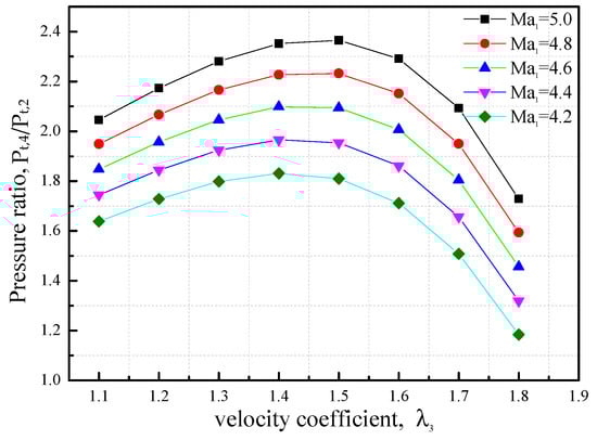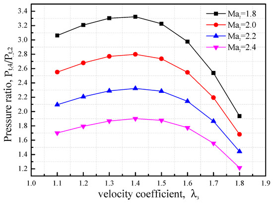 Figure 5 shows the stagnation pressure ratio of the diffuser under different Mach numbers of the primary stream, ranging from 4.2~5.0. The stagnation pressure ratio of the diffuser also initially increased with the velocity coefficient and then decreased sharply. Additionally, the stagnation pressure ratio increased with the increasing Mach number of the ejecting stream since the inlet pressure increased with the increasing Mach number of the ejecting stream, resulting in the pressure rise in the mixed flow. For both Figure 4 and Figure 5, the optimal value of the velocity coefficient for the mixed stream was ~1.4 for the diffuser based on the given parameters, and the stagnation pressure ratio of the diffuser was more sensitive to the Mach number of the ejected stream than the primary flow.