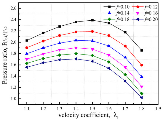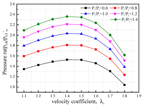 Finally, the ratio of total pressure is given by Equation (25). The pressure ratio of the ejector can be expressed as according to Equations (15) and (24), which indicate the efficiency of the multi-nozzle ejector.