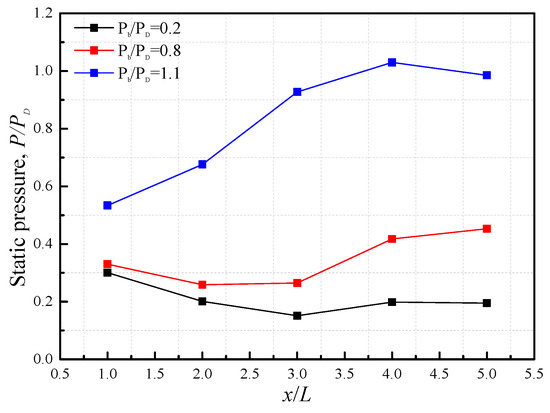 Experimental investigation of the pressure control performance of the designed ejector–diffuser system in a straight-flow wind tunnel was performed. The five measuring points are marked in Figure 2 and the static wall pressures were recorded. Firstly, the ejector–diffuser system was not started (with no supersonic nozzles installed) and only worked as a flow channel for the ejected stream. The ambient pressure at the outlet of the ejector–diffuser was regulated by the vacuum reservoir with an adjustable pressure range from 0.1 PD to 6.0 PD. Figure 8 shows the results of the dimensionless pressure distribution of the supersonic diffuser when the connected ejector–diffuser system was not started. The results show that the pressure changed stably along the flow direction with the dimensionless pressure ranging from 0.2 to 0.8, which indicates that the flow inside the tunnel was a fully developed supersonic stream. The wall pressure increased sharply when the dimensionless pressure ratio, , came to be greater than 1.1. This indicated a flow deceleration and increment of potential energy. Additionally, the occurrence of a shock wave near the tunnel wall also increased the wall pressure and decreased the flow velocity.