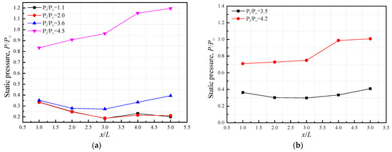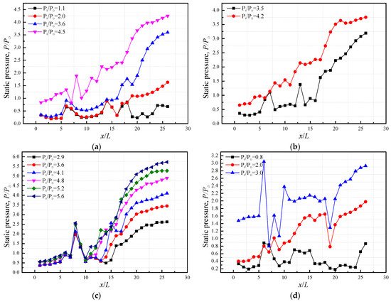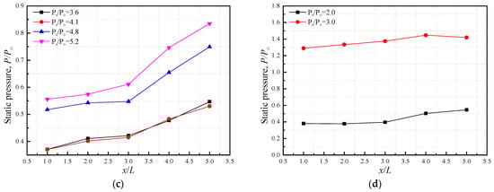 Figure 9 presents the static wall pressure distribution of the supersonic diffuser with different ejector–diffuser systems. Different types of supersonic nozzle plates were clamped onto the nozzle section. As displayed in Figure 1c, all supersonic nozzles were embedded in the wedge plate to reduce flow resistance of the ejected stream. The gas source of these nozzles was supplied and supercharged by a compressor to ensure sufficient inlet pressure and supersonic flow at the outlet of nozzles. Figure 9a shows the results of the static wall pressure when three long nozzle plates were used in the ejector–diffuser system. The results show that a low pressure and vacuum environment () can be maintained in the supersonic diffuser chamber when the dimensionless pressure of the vacuum reservoir was below 2.0. In contrast, the static pressure increased obviously along the flow direction when the dimensionless pressure increased to 4.5, which indicated that the flow condition in the supersonic diffuser was changed by the high backpressure of the ejector–diffuser system. It should be noted that high backpressure could decelerate the ejected stream and result in choking the flow in the supersonic nozzle section. Additionally, the flow structure and shock wave in the supersonic diffuser can be affected by the nozzle section and even the mixing process in the mixing chamber due to the hyperbolic characteristics of the supersonic flow. Figure 9b displays the static wall pressure results of the supersonic diffuser when backpressure ranged from 3.5 to 4.5. Compared with the conditions of no nozzle plate shown in Figure 9d, a stable and smooth pressure distribution can be maintained in the supersonic diffuser with the installation of long nozzle plates in the nozzle section when the backpressure of the ejector–diffuser system is lower than two times the characteristic pressure, . Compared with Figure 9a,b, the pressure results of the three short nozzle plates seemed to provide better performance under high-backpressure conditions. Even though the backpressure increased to 5.2, the static wall pressure was still smaller than . The static wall pressure increased with the increasing backpressure; while obviously remaining lower than that with long nozzle plates in Figure 9a,b. This indicates that the ejector–diffuser system with three short nozzle plates had less effect on the upstream and showed a better capability to maintain supersonic flow conditions and a stable vacuum environment in the supersonic diffuser. Based on these experimental tests, it can be found that the number and length of the nozzle plates had a significant influence on the static wall pressure distribution and the supersonic flow conditions in the supersonic diffuser, which determined the working conditions of the supersonic diffuser.