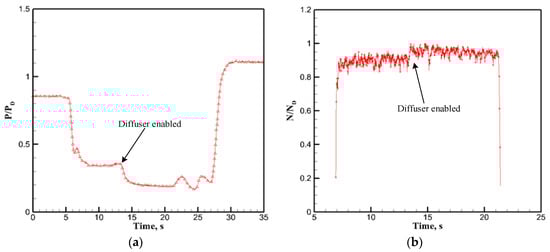 As shown in Figure 11a, the instantaneous pressure in the test section was displayed to validate the pressure controlling performance of the designed ejector–diffuser system. The experimental COIL laser setup was started first without enabling the ejector–diffuser system. The pressure reached a steady value of 0.36 after 10 s. Subsequently, the ejector–diffuser system was started, and the pressure decreased rapidly and a lower pressure environment was achieved in the test section. The result showed that the minimum pressure in the test section can be controlled stably as low as 0.19 , which improved the output power of the COIL laser by approximately 14.1% compared to the disabled ejector–diffuser condition. The experimental results showed that the ejector–diffuser system had a remarkable effect on maintaining a high-vacuum environment and improving the output power intensity of the COIL laser test rig.