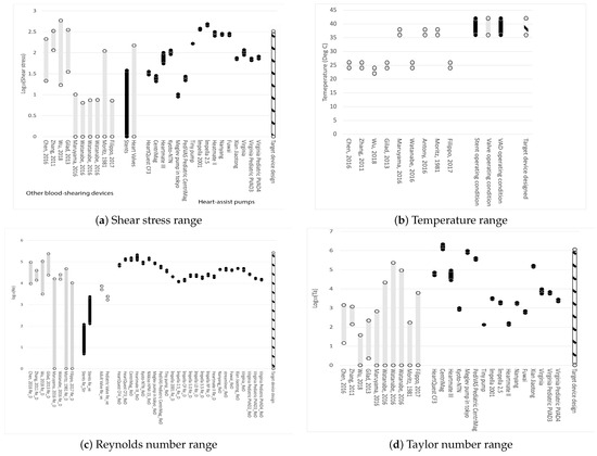 Operating range of parameters of devices. From left to right: black represents other blood-shearing devices, grey represents stents; black shows prosthetic heart valves; grey shows heart-assist pumps; and the cross-hatched black-white bar on the far right represents the conditions of the blood-shearing device examined in this paper. Data from: Moritz, 1981 [111]; Zhang, 2011 [112]; Gilad, 2013 [113]; Chen, 2016 [114]; Maruyama, 2016 [115]; Watanabe, 2016 [116]; Antony, 2016 [117]; Filippo, 2017 [118]; Dimasi, 2017 [119]; Wu, 2018 [120]. References listed alphabetically in this Figure can be fund in the list of references by first author.