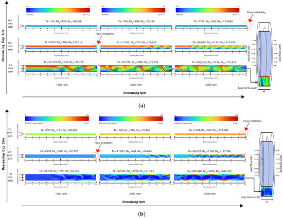 Snapshot of field output from numerical simulation: (a) velocity magnitude contour in the gap region with velocity vectors included for the largest gap rotor (note that the maximum velocity magnitude/color is different for each rpm) and (b) effective shear stress contour in the gap region (note that the maximum shear stress magnitude/color is different for each rpm).