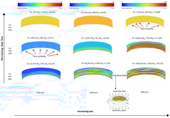 By examining three rotational speeds for the inner rotor rotating at 1000 rpm, 2000 rpm, and 3000 rpm, the simulations resulted in Taylor numbers in the range of 191 to 208,340, Reynolds numbers based on the inner rotor diameter ranging from 35,776 to 114,684, and Reynolds numbers based on the gap size ranging from 154 to 2236. As explained below, these results cover the range of laminar Couette flow, the beginning of flow disturbances, the generation of laminar Taylor vortices, and the generation of turbulent Taylor vortices.