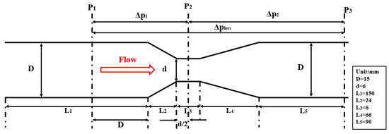 Illustrated in Figure 1 are three pressure-tapping points, labeled P1, P2, and P3, strategically positioned to enhance pressure measurement accuracy. The differential pressures across the front and rear sections of the Venturi are represented by Δp1 and Δp2, respectively, while the overall pressure loss is denoted as Δploss. The subsequent simulation work is based on the structure of this miniature Venturi sensor.