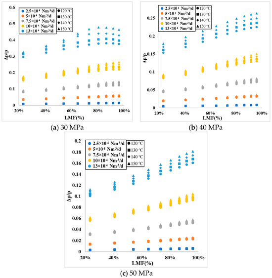 Observing the curves under any given pressure in Figure 3, such as in Figure 3a, it is generally seen that, at 30 MPa, the LMF exhibits a monotonically changing relationship with Δp/Δploss. When the temperature is constant, the curve of the relationship between LMF and Δp/Δploss shifts downwards with an increase in the flow rate. Conversely, with a constant flow rate, the curve shifts upwards as the temperature increases. The trends in Figure 3b,c are consistent with Figure 3a.