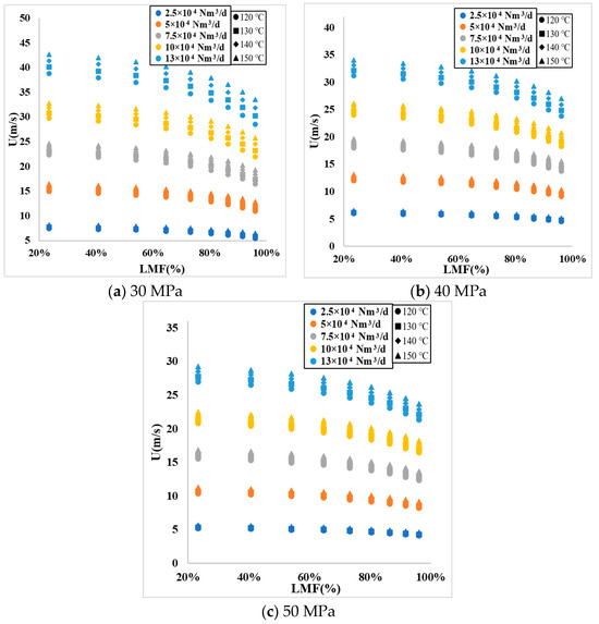 Figure 4 categorizes the relationship between the liquid mass fraction (LMF) and flow velocity U by pressure. The horizontal axis is the LMF, ranging from 20% to 100%, and the vertical axis is the flow velocity U, ranging from 0 to 45 m/s.