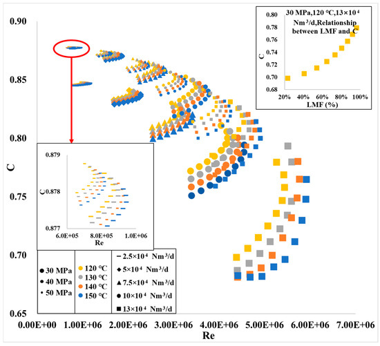First, the influence of LMF variation on C is observed (top-right subplot). Under unchanged conditions, such as 30 MPa, 120 °C, 13.0 × 104 Nm3/d, Re and C exhibit a generally monotonically increasing relationship, as indicated by the red circle in the lower right corner of the figure. The top-right corner plots the relationship between LMF and C under these conditions, showing that C monotonically increases with an increasing LMF.