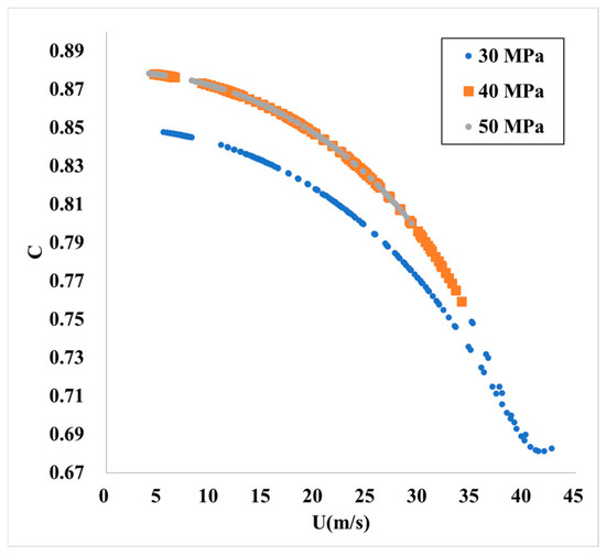 With constant pressure, the relationship between flow velocity and C shows a monotonically decreasing trend. As the pressure varies, the range of operational flow velocities widens with decreasing pressure; at 30 MPa, the curve-relating flow velocity to C shifts downward, with its higher flow velocity portion overlapping with the curves at 40–50 MPa.
