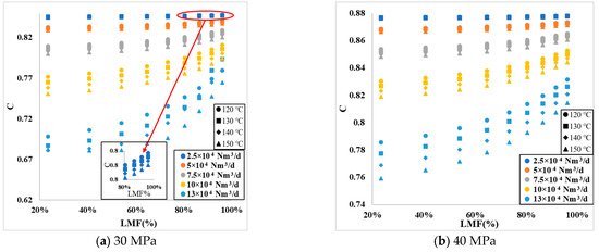 From Figure 7, examining the curves at any given pressure, like in Figure 7a, it is observed that LMF and C generally have a monotonically increasing relationship. With constant temperature, the relationship curve between LMF and C shifts downwards as the flow rate increases. With constant flow rate, the relationship curve between LMF and C also shifts downwards as the temperature increases, with a zoomed-in view of some curves at the bottom. The patterns in Figure 7b,c are consistent with Figure 7a.
