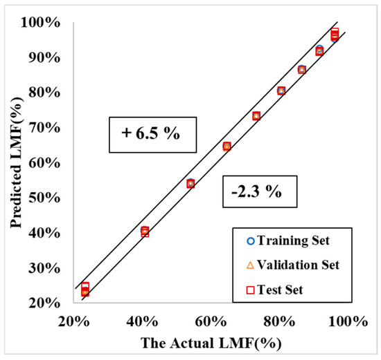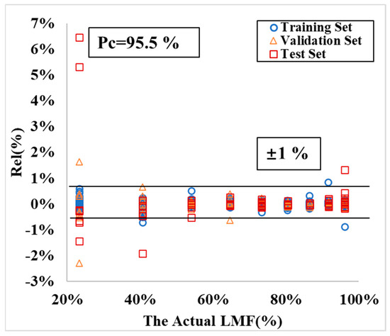 As illustrated in Figure 8, with the actual LMF on the x-axis, the plot shows the predicted LMF results. Here, blue circles represent the training data, yellow triangles indicate the validation data, and red squares denote the testing data. The data points are well-clustered, with Rel ranging from −2.3% to +6.5%. Figure 9, with the actual LMF on the x-axis, shows the predicted LMF relative error results. At a confidence probability of Pc = 95.5%, corresponding to twice the standard deviation, the error band for LMF is ±1%.