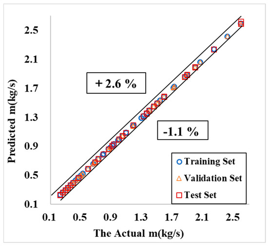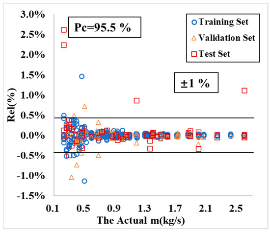 Figure 10, with the actual total mass flow rate m on the x-axis, plots the predicted total mass flow rate m results. The data points are well-clustered, with the relative error Rel ranging from −1.1% to +2.6%. Figure 11, with the actual m input into the simulation on the x-axis, displays the relative error results of m predicted by the LM neural network model. At a confidence probability of Pc = 95.5% corresponding to twice the standard deviation, the error band for m is ±1%.