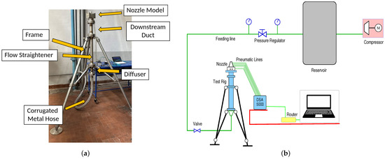 The pressure line that feeds the nozzle consists on a 25 mm pipe line at 10 bar with a 5 m3 reservoir and a dedicated compressor. The test rig is positioned on a frame, as shown in Figure 1a. A corrugated metal hose with an inner diameter of 25 mm provides the feeding gas (air, with a regulated total pressure bar and a total temperature of about 288 K) and is connected to a diffuser, followed by a flow straightener. The system allows for reasonable long tests with mass flow rates of the order of 1 kg/s. Further details regarding the experimental test rig can be found in Ref. [28].