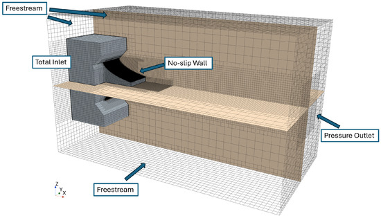 The computational domain consists in a polyhedral mesh, counting about 2 M cells. The conditions imposed at the boundaries of the computational domain follow the guidelines of Poinsot and Lele [34] for supersonic and subsonic mixed flows, and are presented in Figure 3. On the walls of the nozzle model, a no-slip adiabatic wall condition was imposed. The outflow boundary, on the right edge of the computational domain, features a pressure outlet condition, where a value of static pressure is imposed only for cells in which the flow is subsonic, whereas for a supersonic outflow, the pressure at the outlet is the same as the cell. The inlet conditions are imposed as total pressure and total temperature conditions, with values corresponding to the inside of the nozzle’s chamber. Lastly, the other boundaries of the domain have been set to freestream conditions, where the value of static pressure, static temperature and an inlet Mach number were imposed. The Mach number was set to a very low value of for the numerical stability of the boundaries. All simulations were carried out with a inlet total temperature K, an ambient pressure Pa, and a turbulence viscosity ratio equal to 10, respectively.