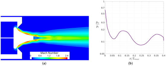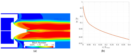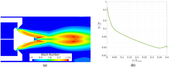 The results for nprd in terms of Mach iso-contours and wall pressure distribution are shown in Figure 9a and Figure 9b, respectively. From Figure 9a, it is observed that, in the case of the design , the shear layer no longer tends to move towards the center line, and the expansion occurs monotonically until reaching ambient pressure conditions. This design case demonstrates an almost one-dimensional exhaust flow (see e.g., [2]).