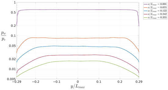 In Figure 11b,c, the spanwise pressure distributions on the plug wall at different streamwise locations are shown for the case at npr . The streamwise locations have been chosen corresponding to the maximum and minimum values of the pressure distribution along the x-axis direction observed in the symmetry plane (see Figure 6b), respectively. It can be observed that at different streamwise positions, there is a sufficiently wide region where the pressure remains almost constant. However, three-dimensional effects are clearly visible going towards the sides of the plug, and become more relevant at the end of the nozzle. In Figure 11b, the re-compression regions originated from the nozzle throat evolving towards the center line of the linear plug are shown. In Figure 11c, the presence of minima in the pressure distribution suggests the occurrence of expansion waves on the sides of the previously described re-compression regions.