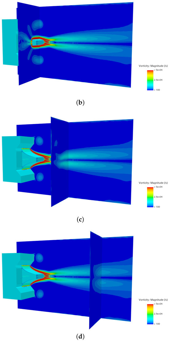 Colormap of vorticity magnitude at npr for different axial positions: (a) , (b) , (c) and (d) .