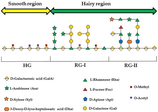 An illustration of the three polysaccharide segments commonly found in all pectin species: homogalacturonan (HGA), rhamnogalacturonan-I (RG-I), and rhamnogalacturonan-II (RG-II). The figure was created following the symbol nomenclature for glycans guidelines [,].