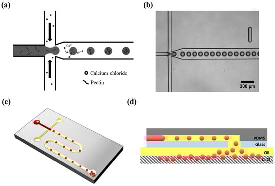 Microfluidic device for generating pectin hydrogel microspheres: (a) A schematic illustration of external cross-linking within the microchannel. (b) An optical microscope image of pectin droplets within the microchannel. (c) An overall schematic of the microfluidic device containing pectin hydrogel microspheres and the outlet port aligned with the hole in the slide glass. (d) A cross-sectional view of the microfluidic device [].
