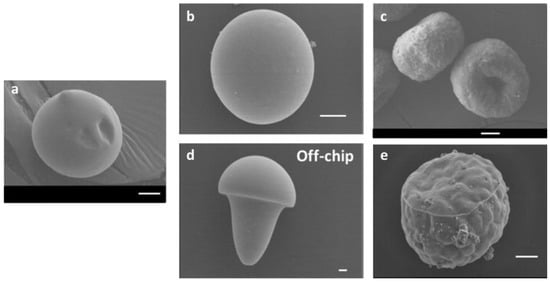 Pectin-based microparticles with diverse morphologies, such as spherical, doughnut-like, oblate ellipsoid, and mushroom-like shapes (Figure 3), were produced using a microfluidic platform. This platform exploited different gelation methods (internal and external gelation) and water diffusion in microfluidic channels (on-chip), as well as the deformation of pre-formed droplets outside the channels (off-chip) []. Studies of the swelling behavior of hydrated and dried–rehydrated pectin microparticles indicated that drying did not significantly affect their shapes and swelling capacities, except for the mushroom-like microparticles []. The precise control of microparticle morphology opens opportunities for applications in various fields, such as drug delivery, optical devices, and the formation of advanced materials.