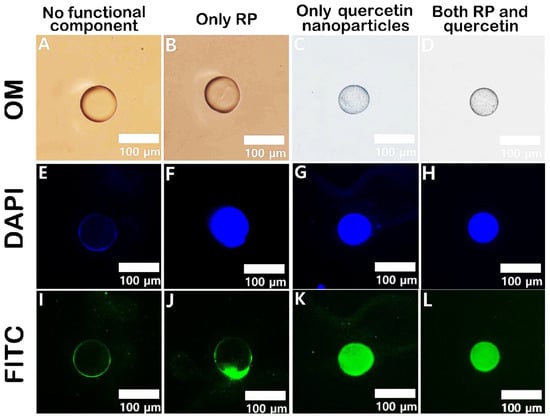 Optical microscopy images, along with 4′,6-diamidino-2-phenylindole (DAPI)- and fluorescein isothiocyanate (FITC)-filtered fluorescence images, of various pectin microcapsules: (A,E,I) empty pectin microcapsule, (B,F,J) RP-containing pectin capsule, (C,G,K) quercetin-containing pectin capsule, and (D,H,L) pectin capsule containing both RP and quercetin [].