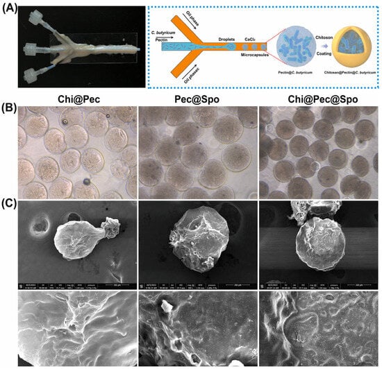 (A) The microfluidic device (left) and a schematic of the microcapsule preparation process (right), and (B) microscope images and (C) SEM images of chitosan–pectin, pectin–spore, and chitosan–pectin–spore microcapsules [].