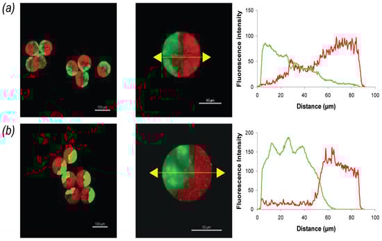 Fluorescence confocal microscopy images and fluorescence intensity profiles for (a) FA–pectin/Bodipy–pectin homo Janus microbeads and (b) FA–alginate/Bodipy–pectin hetero Janus microbeads. Excitation wavelengths for FA and Bodipy were set at 488 nm and 561 nm, respectively, with emission fluorescence recorded between 500 and 530 nm (green) and 570 and 620 nm (red). Flow rates for FA–pectin (or FA–alginate), Bodipy–pectin, and oil in each channel were 1 μL/min, 1 μL/min, and 18 μL/min, respectively. Scale bars: 100 μm (left) and 50 μm (middle) [].